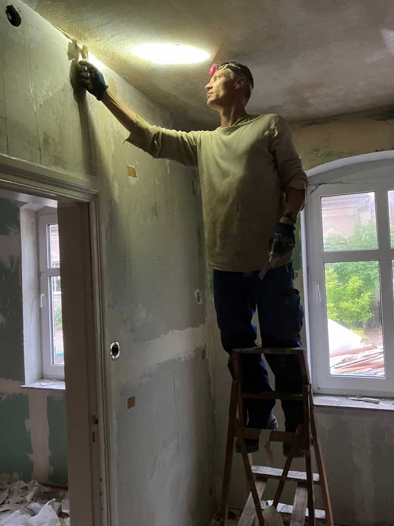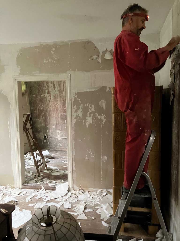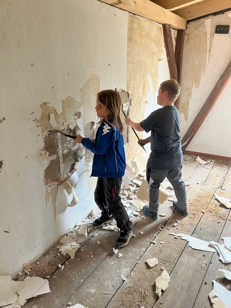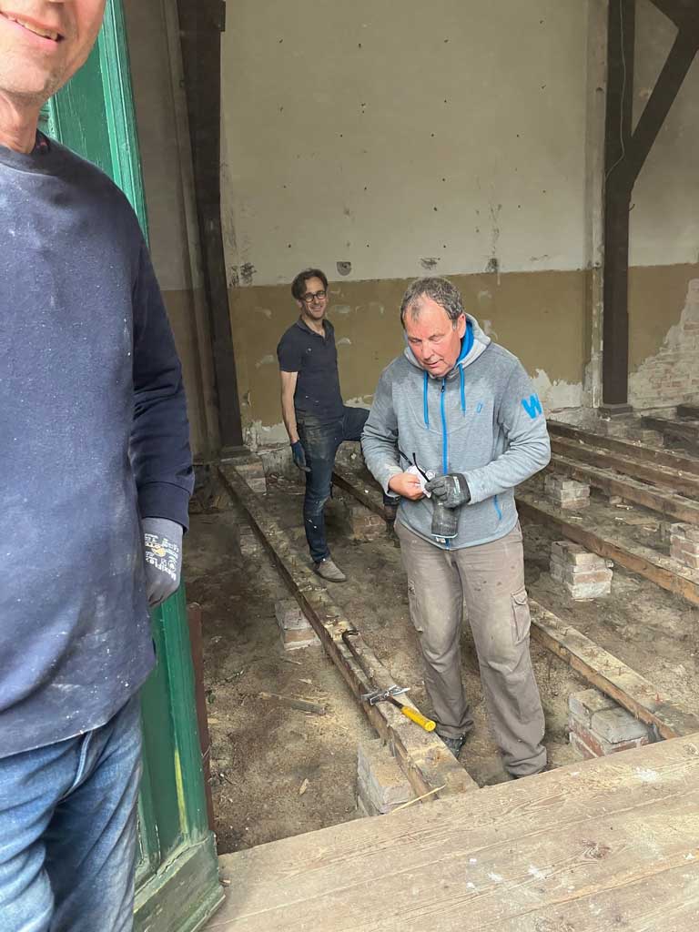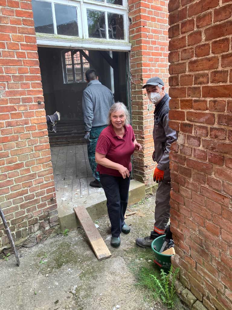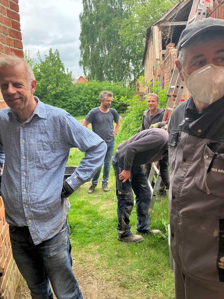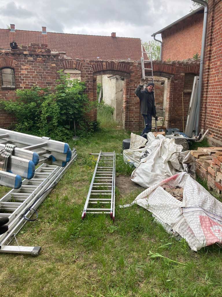 Nachdem nun unser vor fast drei Jahren gestellter Fördermittelantrag größtenteils bewilligt und auch endlich die Baugenehmigung erteilt wurde, konnte es mit dem Umbau des alten Gaststättenensembles zu unserem neuen Gemeindezentrum losgehen. Mittlerweile beliefen sich die geschätzten Kosten der Maßnahme schon auf fast eine Million Euro, von der wir aber 75% gefördert bekommen. Um trotzdem so sparsam wie möglich mit den finanziellen Ressourcen umzugehen, haben wir vor Baubeginn noch einen schönen Einsatz mit vielen kleinen und großen Helfern gemacht, in dem wir im Saal und Hinterhaus und in der Scheune so viel wie möglich beräumt haben. Vielen Dank an alle Helferinnen und Helfer